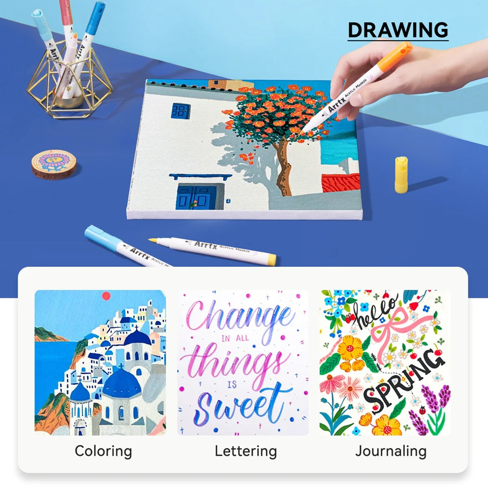 Suitable for Multiple Surfaces: Arrtx acrylic markers set provides water-based smooth ink and excellent coverage for a variety of surfaces, works for paper, cardstock, metal, rock painting, wood, plastic, canvas, fabric, stone, Easter eggs, easter decoration, metal, calligraphy, scrapbook, brush lettering, birthday gifts, greeting card, or any DIY crafts projects and more. Let's express imagination!