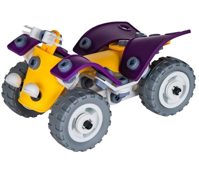 This engineering design toy package includes 100 parts that can be assembled into 1 of 4 different models.