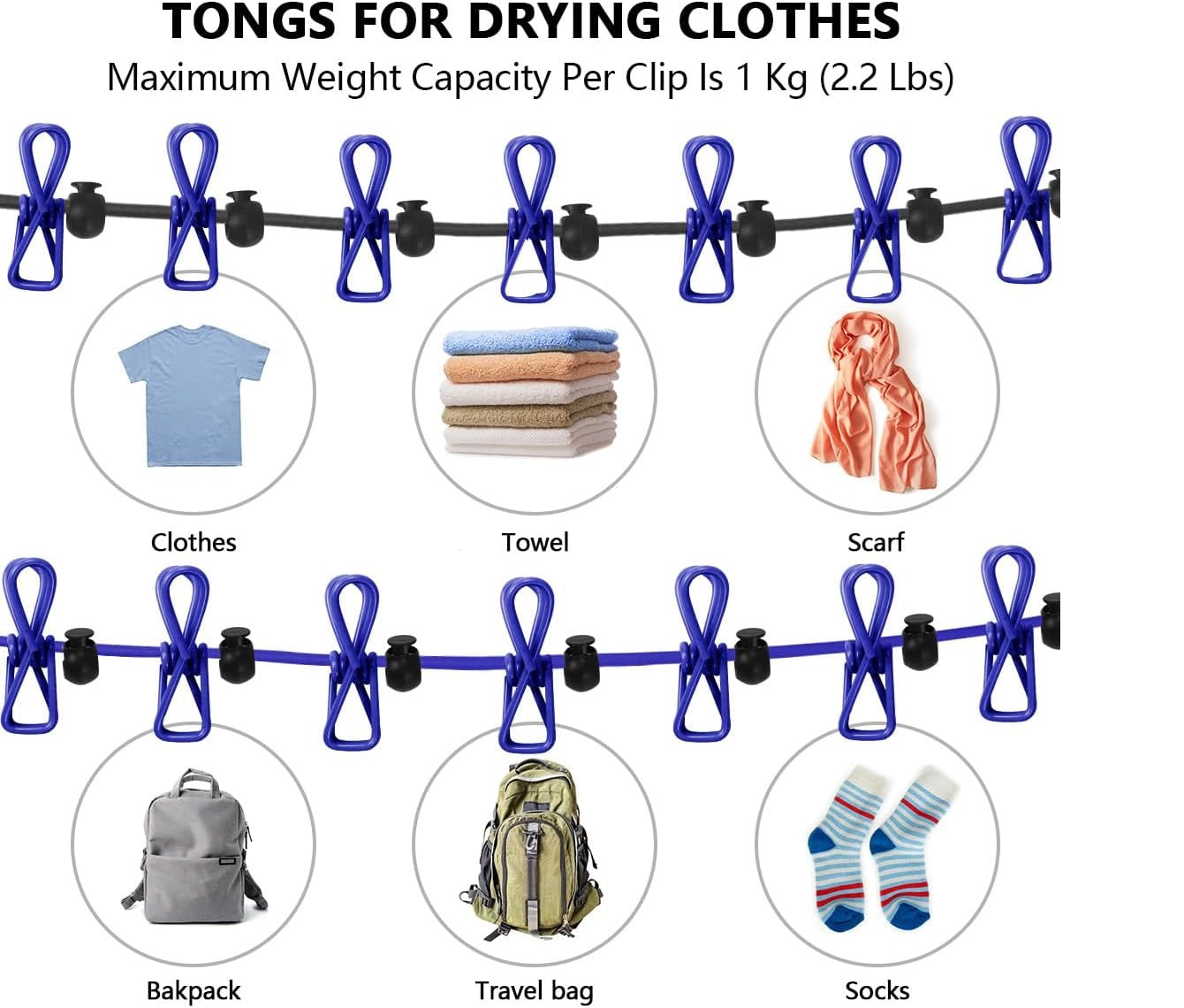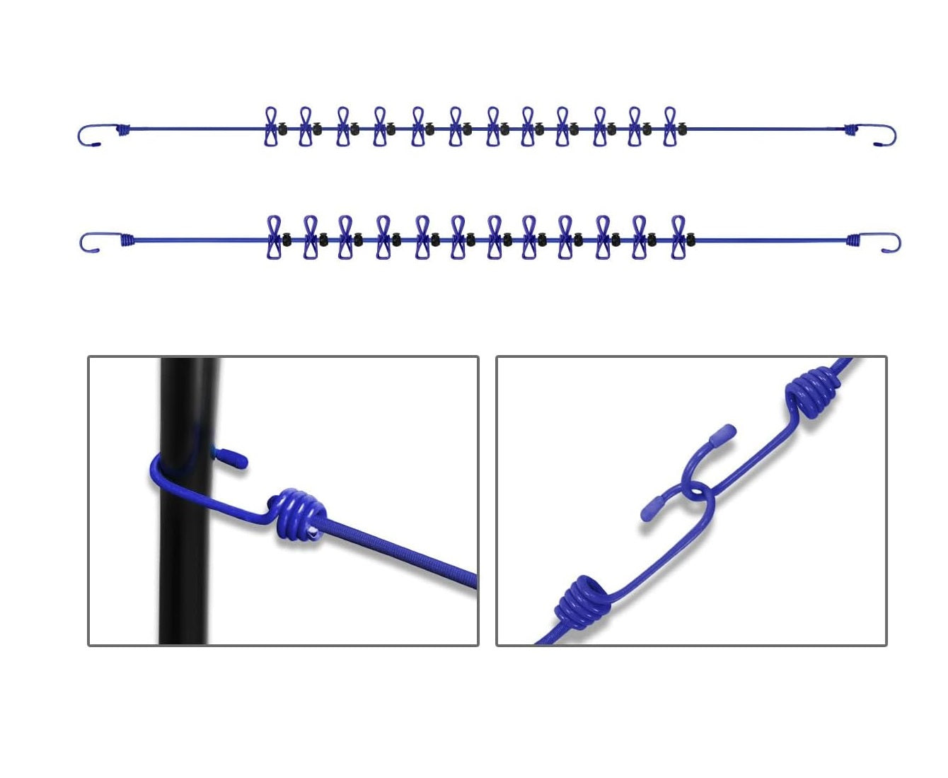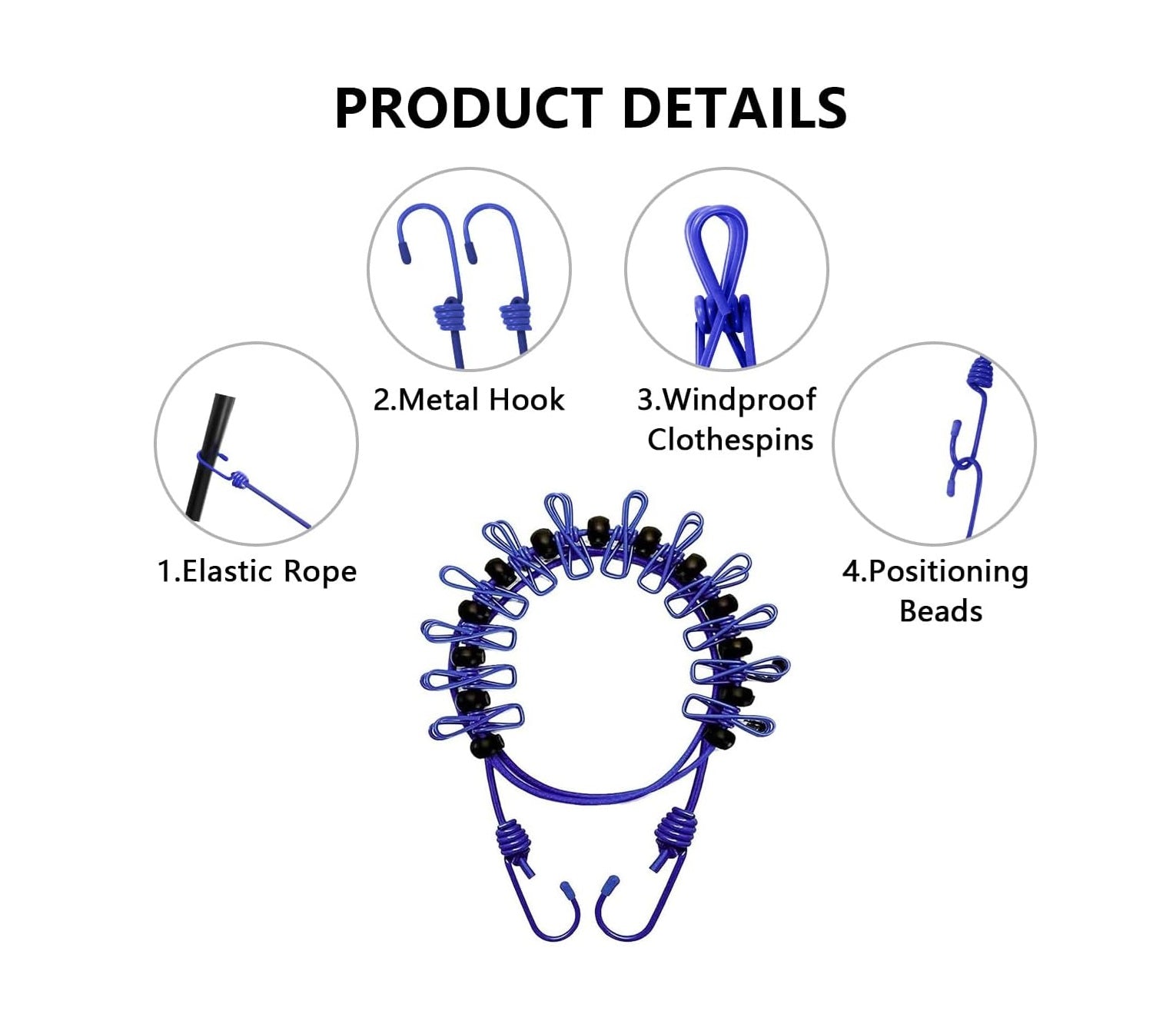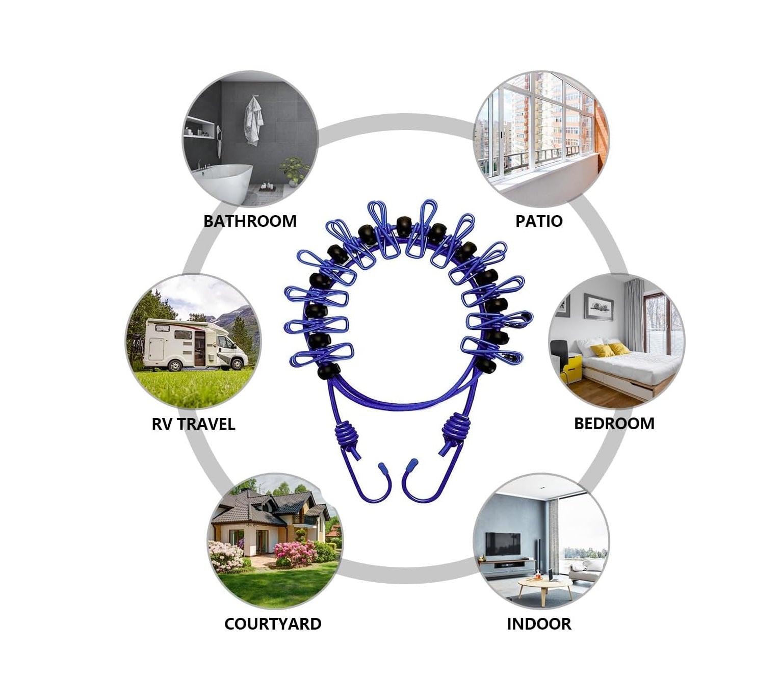 Washing line with reinforced steel hooks can be hung anywhere, outdoors, indoors, camping, traveling.