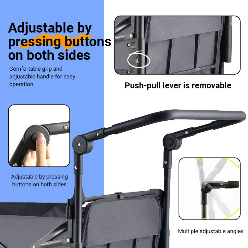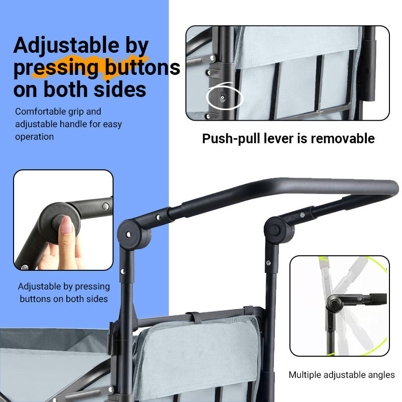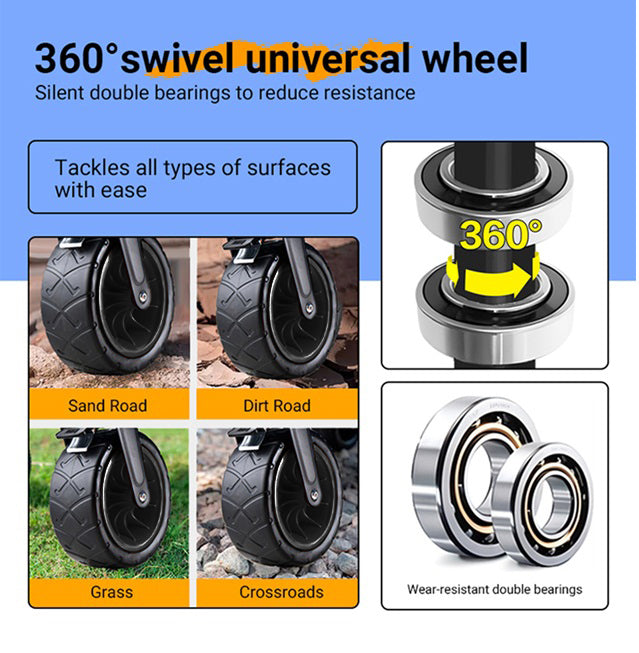 The 360 all-terrain swivel wheels gives you an unparalleled exploration journey with the cart. Equipped with oversized, extra-wide swivel wheels, our voyager wagon allows for effortless navigation across various terrains such as beaches, grass, gravel and paving.